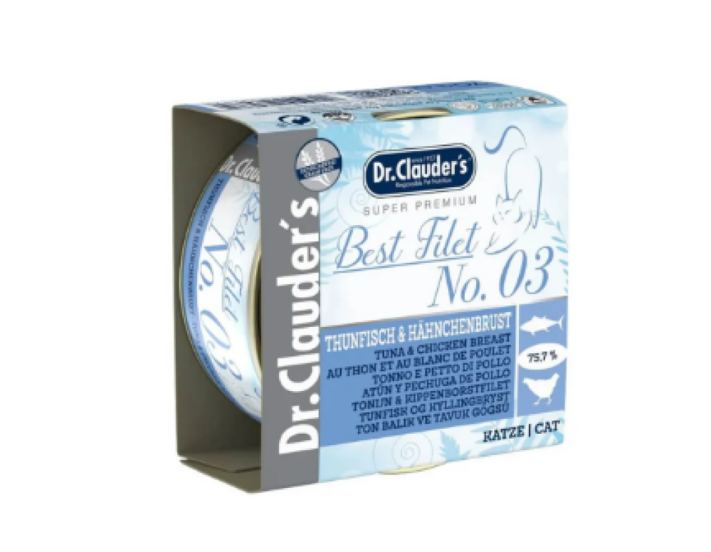 هل تبحث عن أفضل مصدر بروتين نقي لقطتك؟ هذا المعلب هو الخيار المثالي! د. كلاودرز بست فيليه رقم 03 هو وجبة مكمّلة (Complementary Food) فاخرة تجمع بين بروتينين عاليي الجودة، بنسبة مكونات حيوانية تصل إلى 75.7% من فيليه التونا وصدر الدجاج الطري.